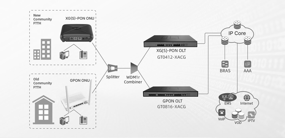 Supports multiple services: XGS-PON supports multiple services, including high-speed Internet access, video transmission, VoIP (Voice over Internet Protocol), etc., to meet users' needs for different types of services.