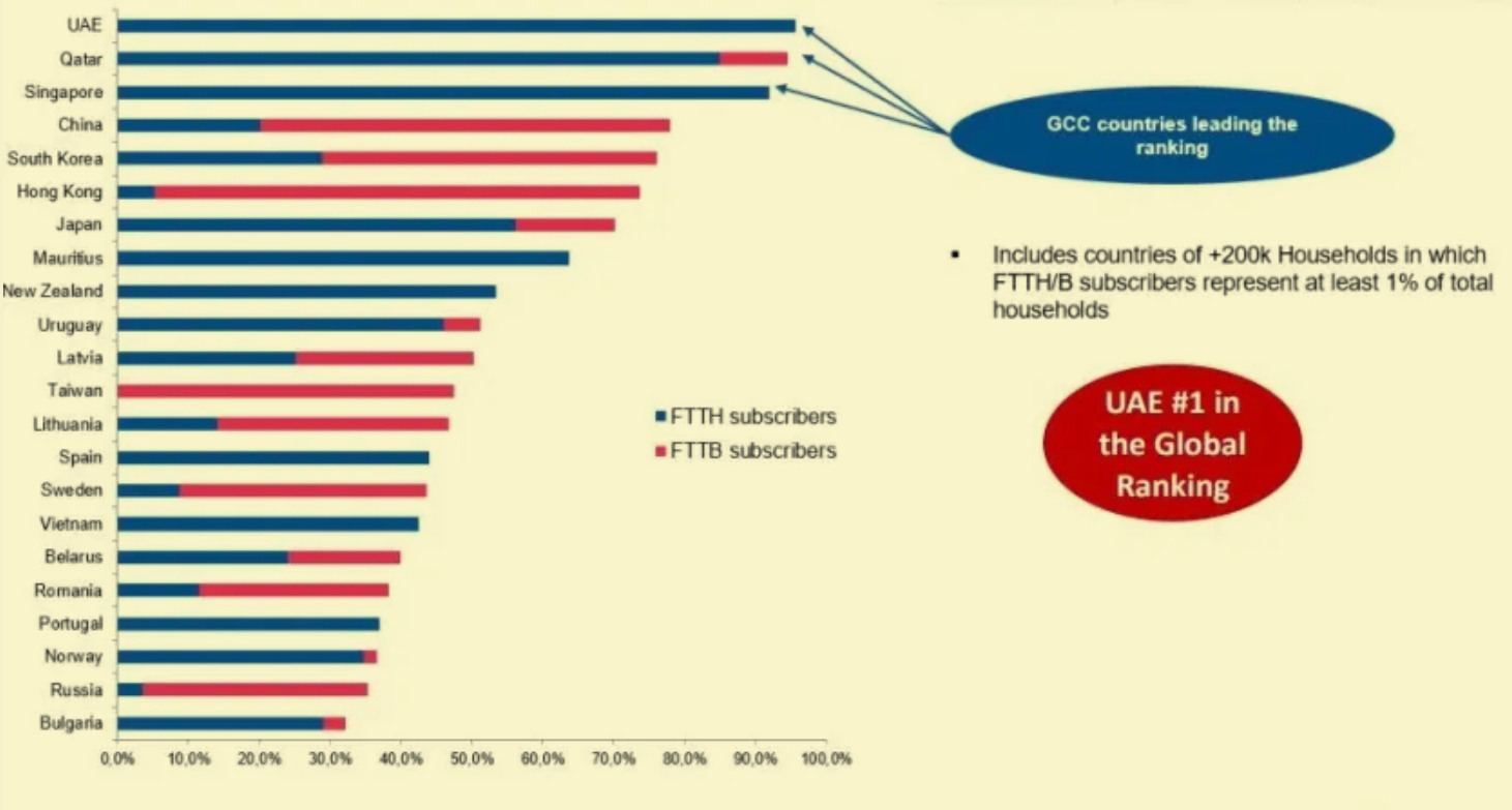 The UAE is the number one country in the world with FTTH covering 95.7% of UAE homes and its fiber network coverage exceeds that of Singapore, China, Korea, Hong Kong and Japan.