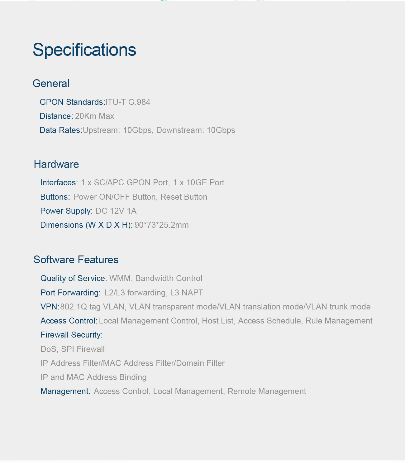 The XGS3100-Y next-generation XGSPON terminal is the perfect solution. With lightning quick 10Gbps symmetric transmission, it offers incredible bandwidth for high-speed downloads, seamless video streaming, lag-free online gaming, and crystal-clear VoIP calls. Robust quality of service controls and advanced security features ensure your network stays up and running smoothly. Plus with its extensive VLAN and multicast support, the XGS3100-Y easily handles any network configuration. Sleek, compact and rack-mountable, this powerful optical terminal brings carrier-grade fiber access right to your home or office. Get ahead with future-proof fiber speed - upgrade to the XGS3100-Y XGSPON terminal today!